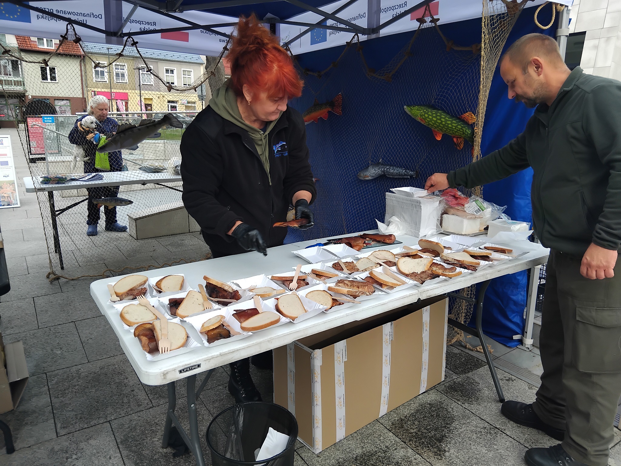 Na stoisku rybak zapraszał do zrobienia sobie zdjęcia (rybna fotościanka).