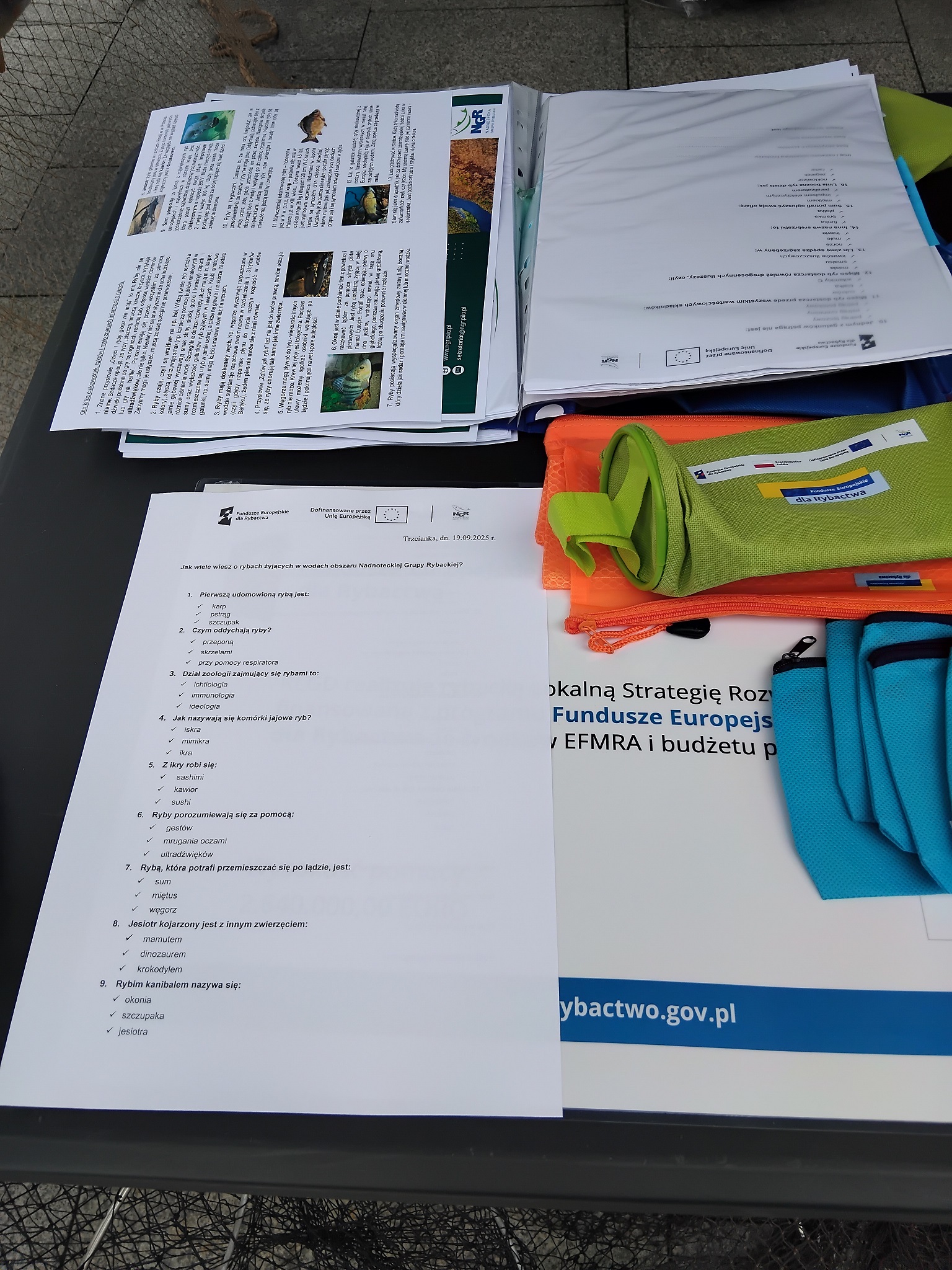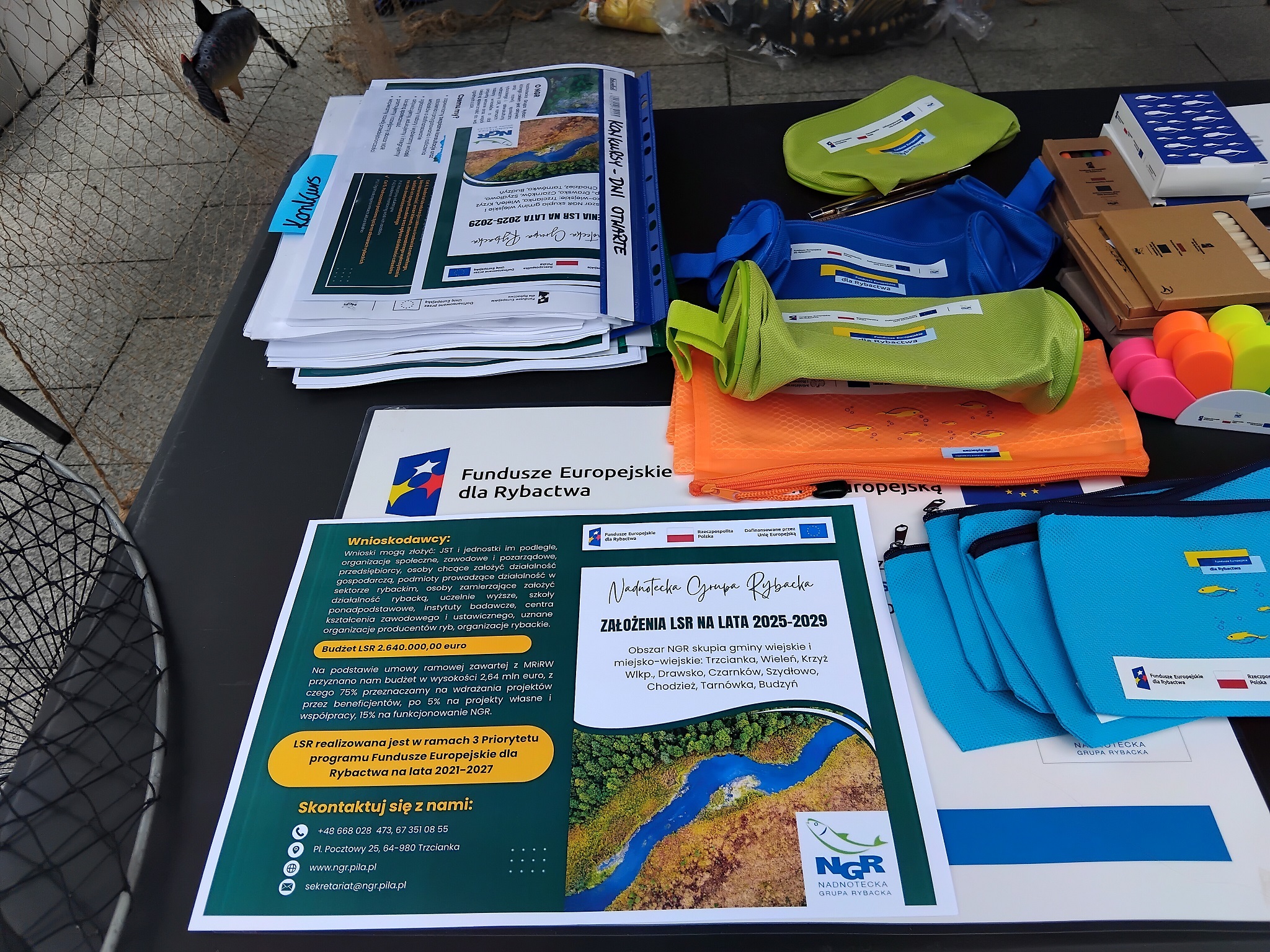 Mieszkańcy Trzcianki dopisali, pomimo porannej niezbyt ładnej pogody. Prawie wszyscy odwiedzający nasze stoisko z chęcią wypełniali testy wiedzy na podstawie przygotowanej ulotki, co miało na celu zapoznanie się z podstawowymi zagadnieniami związanymi z działalnością naszego stowarzyszenia oraz wdrażanej przez niego Lokalnej Strategii Rozwoju na lata 2025-2029. Uczestnicy dowiedzieli się, co oznaczają skróty NGR oraz FEdR 2021-2027, jakie gminy należą do NGR, jacy wnioskodawcy mogą złożyć wnioski oraz jakie rodzaje projektów mogą być wdrażane w ramach LSR, czym zajmuje się NGR oraz gdzie mieści się Biuro NGR. Za prawidłowo wypełniony test, można było wybrać gadżet promocyjny spośród wielu, które na tą okazję przygotowały NGR oraz Ministerstwo Rolnictwa i Rozwoju Wsi. Na stoisku były dostępne także materiały informacyjno-promocyjne na temat programu Fundusze Europejskie dla Rybactwa na lata 2021-2027, zawodu rybaka oraz książeczki dla dzieci o rybach, przygotowane przez MRiRW.