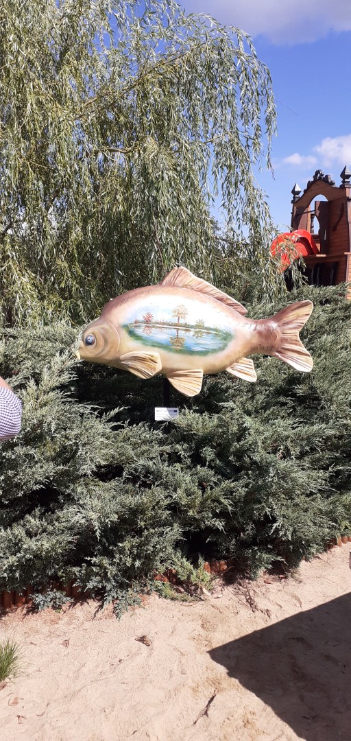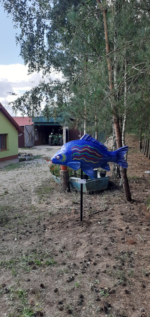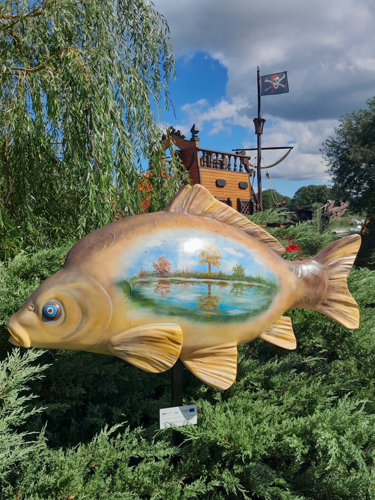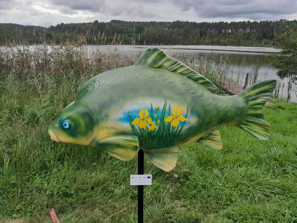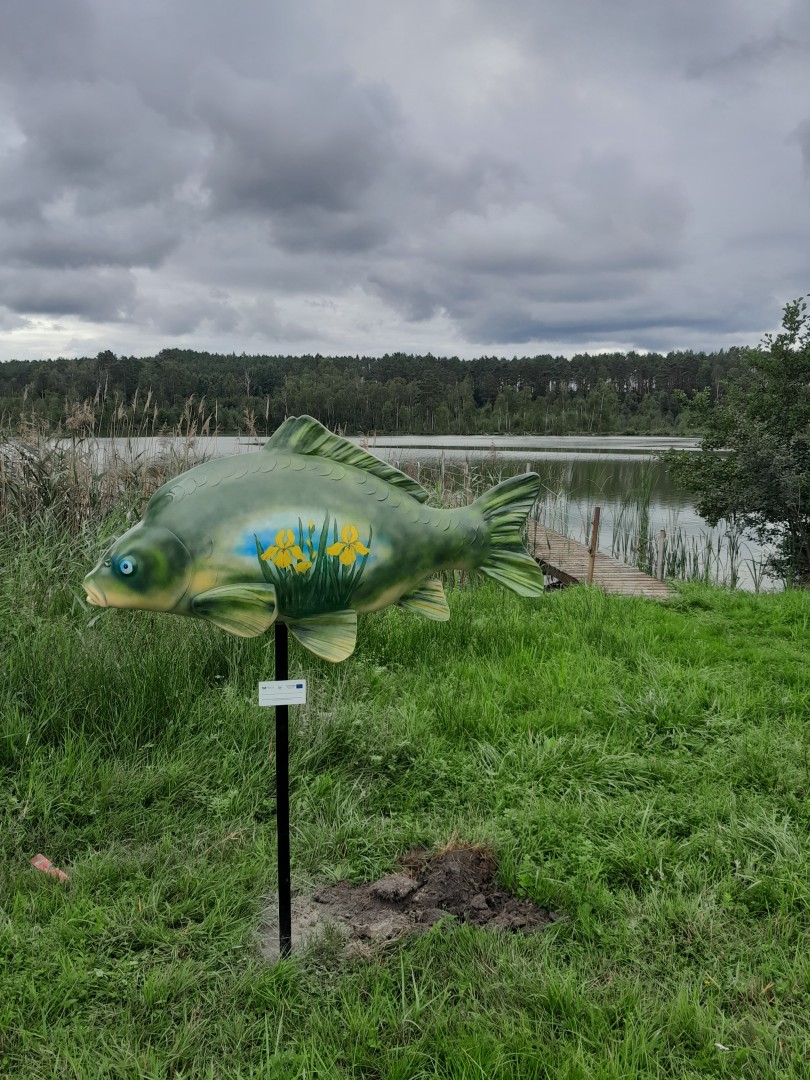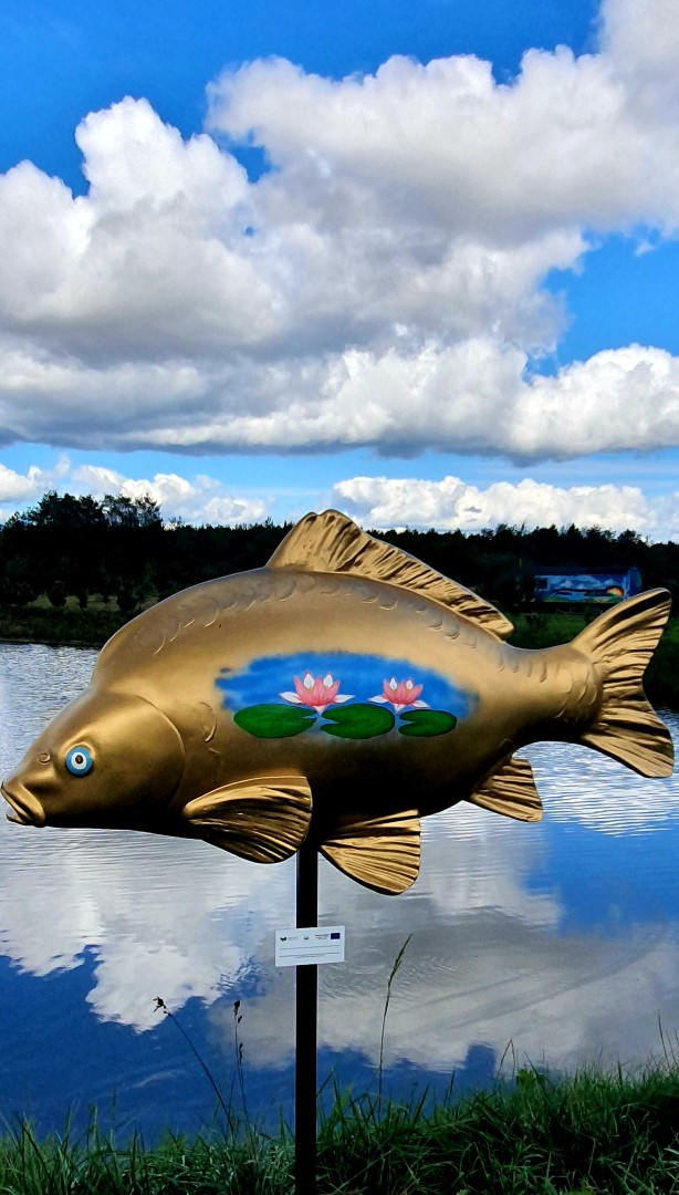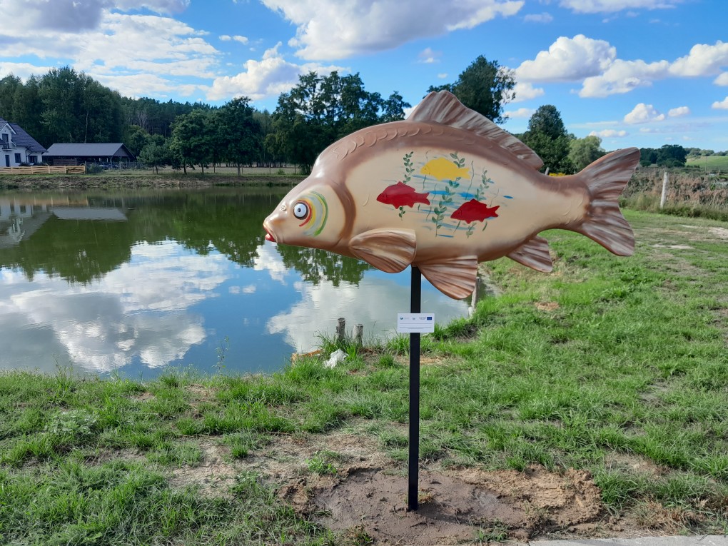 Pod koniec sierpnia 2022 r. na terenie siedmiu gospodarstw rybackich z naszego obszaru zamontowano figury ryb – duże karpie, wykonane z żywicy.