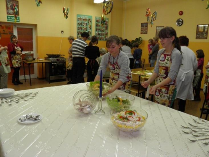 Po skończonej pracy wszyscy spotkali się przy stole zastawionym pysznymi sałatkami. Dyrektor szkoły Jolanta Baran podziękowała wszystkim uczestnikom za udział w warsztatach i zachęciła do dalszej współpracy.