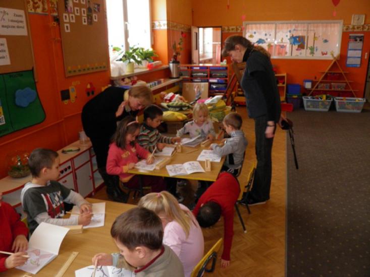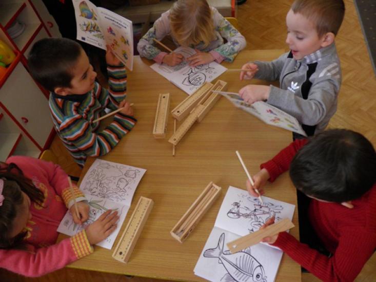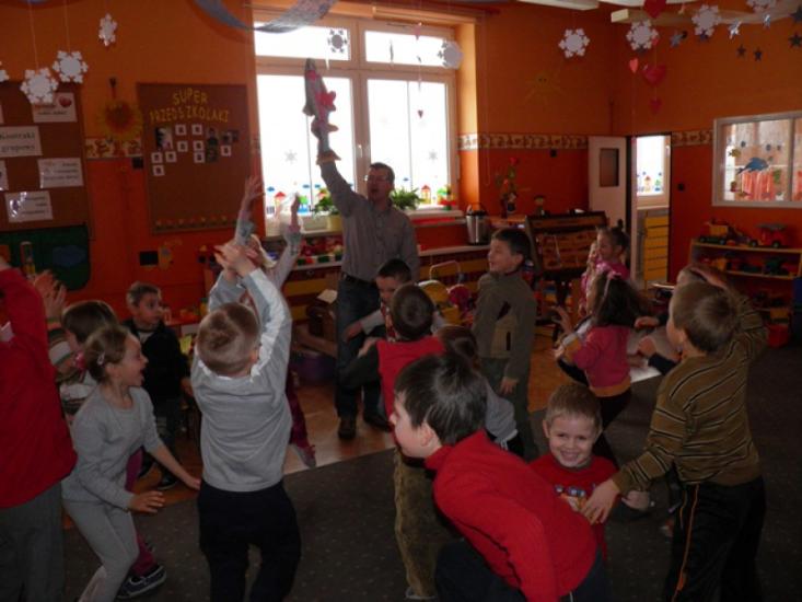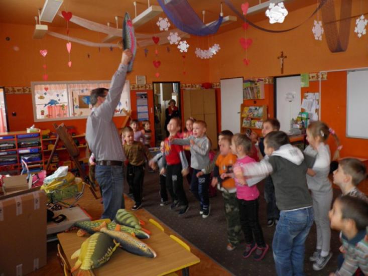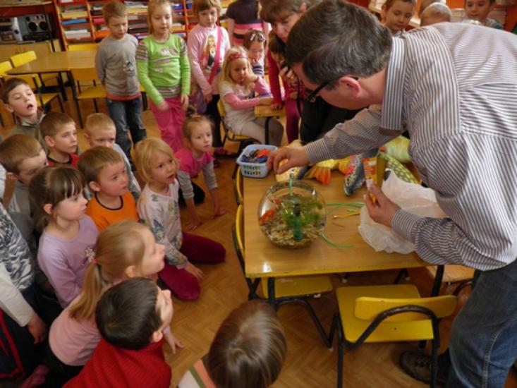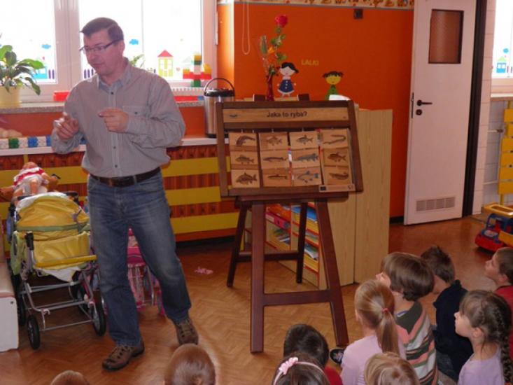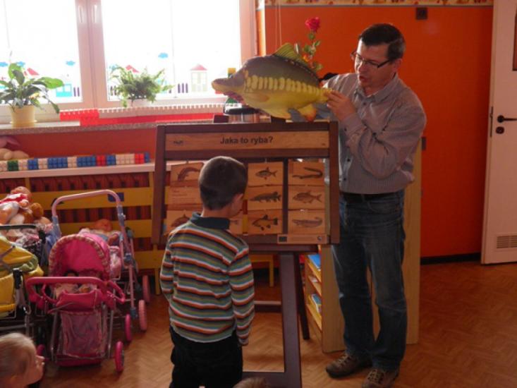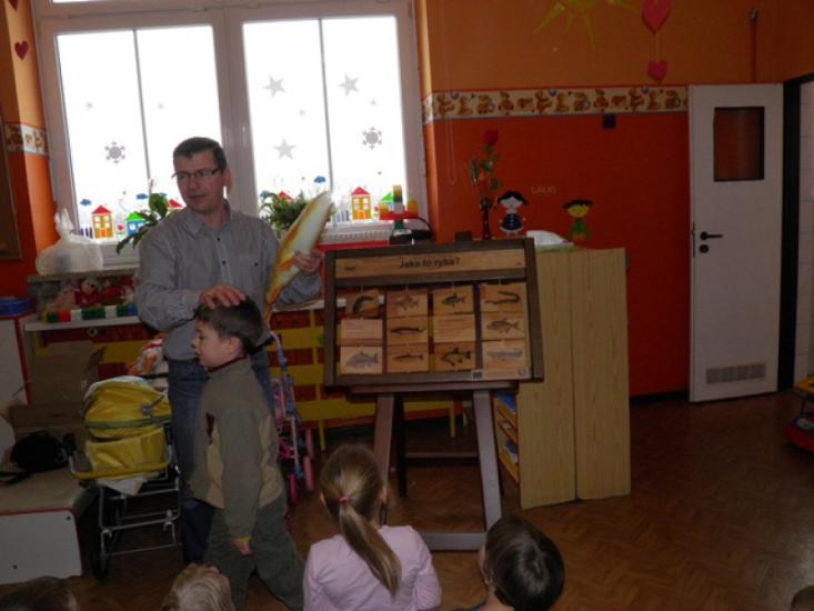 Pogadanka była przerywana grami, zabawami i pląsami, a jednym z punktów było kolorowanie sylwetek ryb. Największy entuzjazm dzieci wywołało jednak pojawienie się żywej złotej rybki, którą razem z wyposażonym akwarium podarowaliśmy przedszkolu. Sześciolatki z Żabek obiecały regularne karmienie welona i czyszczenie akwarium.