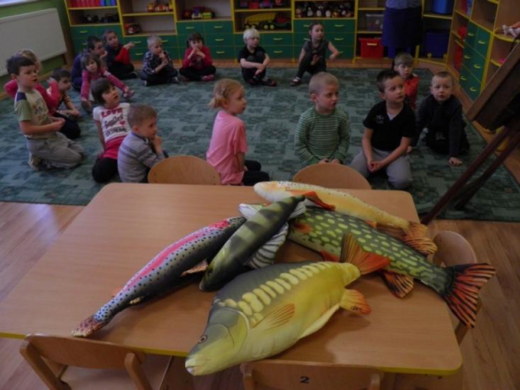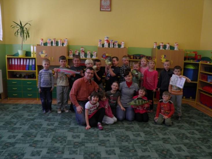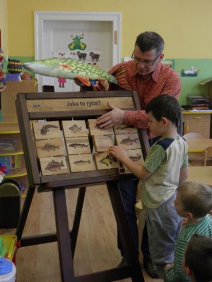 Jak zwykle przy tego typu spotkaniach, dzieci żywiołowo reagowały na nasze propozycje zabaw i gier, chętnie dzieliły się swoją wiedzą na temat ryb i z zainteresowaniem słuchały nowych informacji o życiu ryb i pracy rybaka. Sześciolatki ucieszyły też prezenty, które zostawiliśmy w placówce, a które łączą funkcję zabawową z edukacyjną: maskotki w kształcie określonych gatunków ryb, tablicę edukacyjną, tematyczne kolorowanki z kompletami kredek i wyposażone akwarium wraz z rybką.