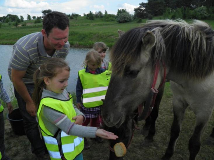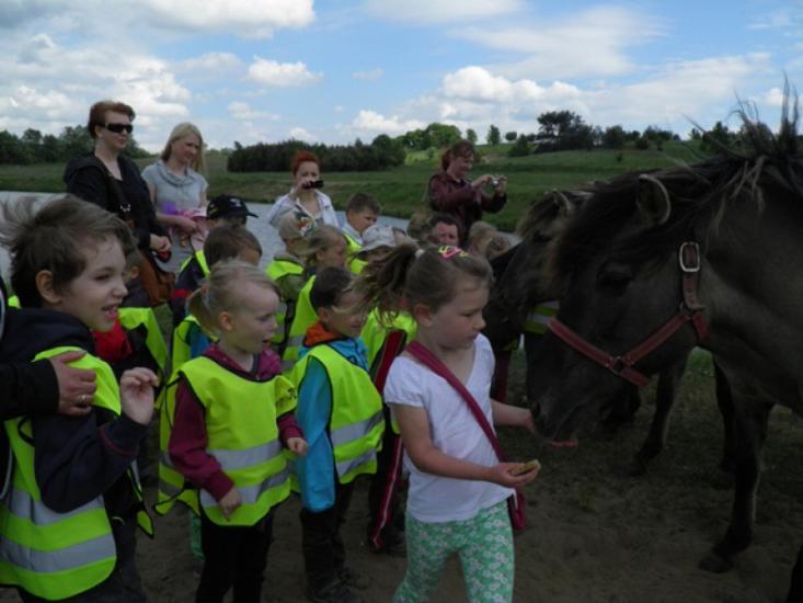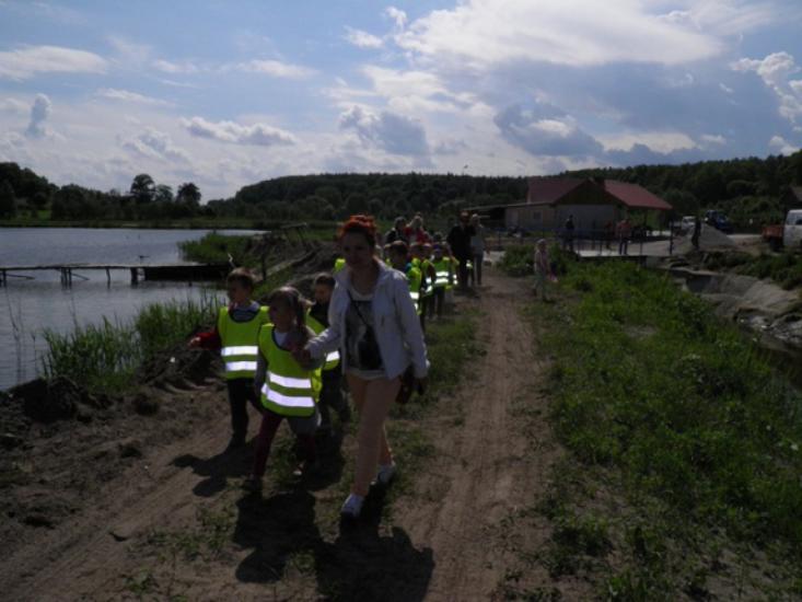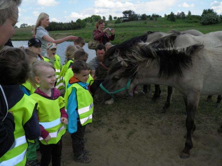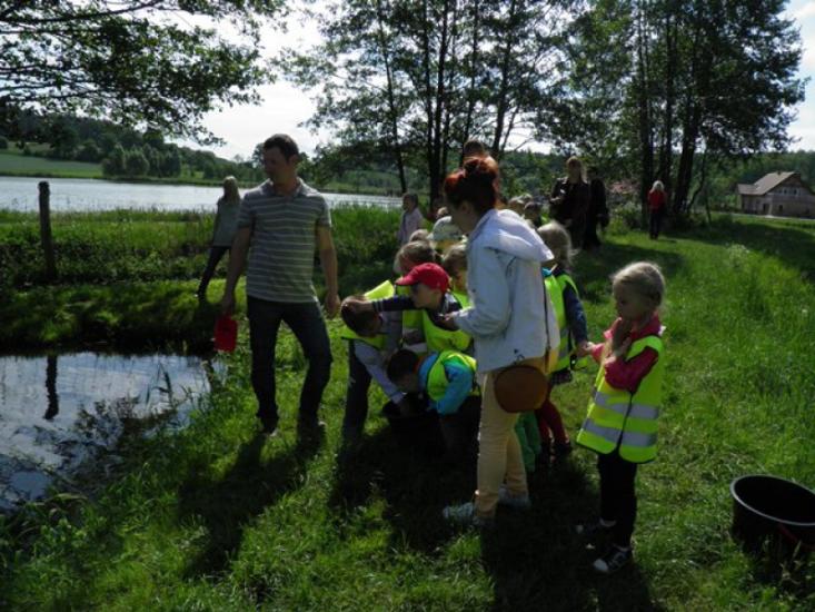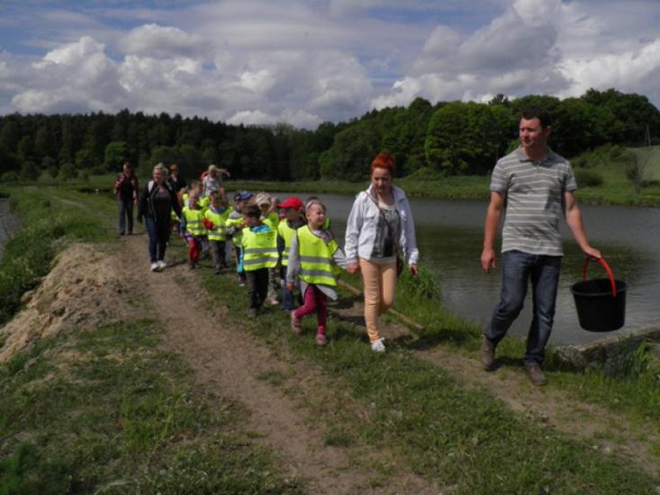 Gospodarstwo w Teresinie prowadzą rodzinnie państwo Sanoccy, a dzieci oprowadził po stawach pan Karol Sanocki. Opowieść rozpoczął od magazynu paszowego, gdzie przedszkolaki zobaczyły, jaka jest różnica w paszy dla ryb karpiowatych różnej wielkości oraz jak wygląda granulat dla pstrągów. Potem dzieci same karmiły pstrągi w stawach i obserwowały karmienie karpiowatych z łodzi. Pan Karol wytłumaczył też różnice w hodowli pstrąga i karpia oraz opowiedział co to jest i jak funkcjonuje łowisko specjalne. W trakcie spaceru po groblach przedszkolaki obserwowały roślinność i ptaki: czaple, kormorany i mewy, zjawił się nawet pierzasty król naszych wód – bielik. Dodatkową atrakcją było karmienie koników polskich, które strzygą trawę na groblach tego gospodarstwa.