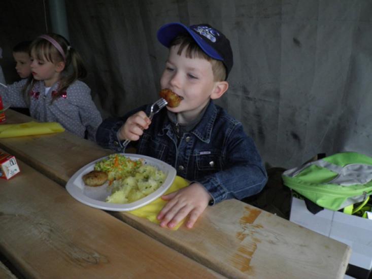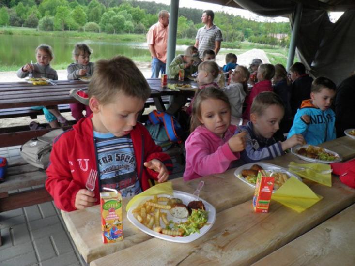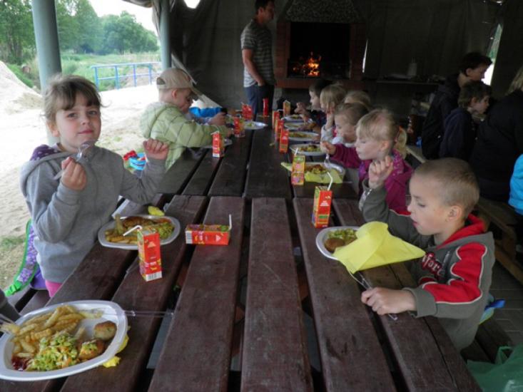 Wizytę zakończył posiłek rybny. Dzieci poczęstowano kotletami mielonymi przygotowanymi z czterech gatunków ryb: karpia, lina, szczupaka i amura. W trakcie wizyty dzieci miały okazję poznać pracę rybaka, odpocząć na świeżym powietrzu i przekonały się, że posiłek rybny może być smaczny i pozbawiony ości.