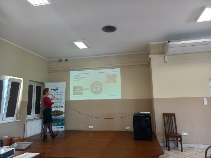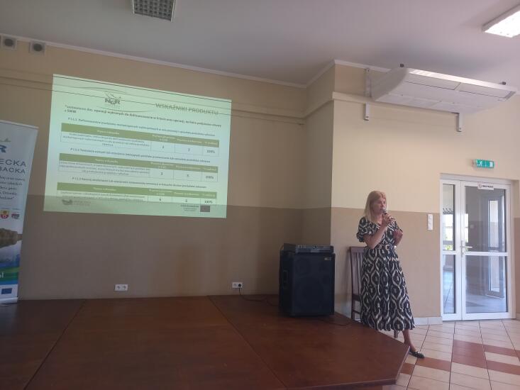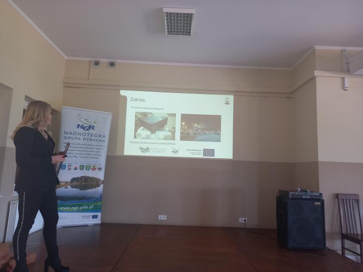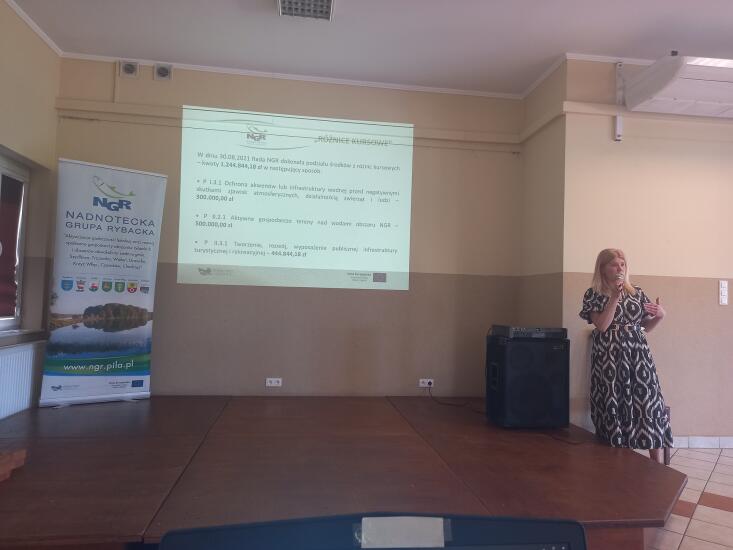 Konferencję rozpoczęła Pani Kierownik, która podsumowała dotychczasową działalność Stowarzyszenia, przedstawiając informacje na temat zrealizowanych naborów wniosków o dofinansowanie z PO Ryby 2014-2020 oraz stanu wdrażania LSR.